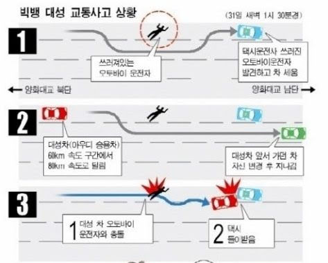 Pojazd jadący przed Daesungiem (zielony na obrazku) był w stanie zauważyć leżacego pana Hyuna oraz taksówkę, która miała włączone światła awaryjne. Daesung nie był w stanie zareagować na czas, jako że jechał z predkością 80km/h podczas gdy dozwolone było 60km/h. Potrącił motocyklistę, ciągnąc go 22,8 metrów i uderzył w zaparkowaną taksówkę. Podczas śledźtwa Daesung zeznał, że nie widział pana Hyuna leżącego na ulicy i zobaczył go dopiero, gdy wyszedł ze swojego audi, by sprawdzić co się stało z taksówkarzem. Ujawniono, że Daesung i taksówkarz nie byli w stanie upojenia alkoholowego.